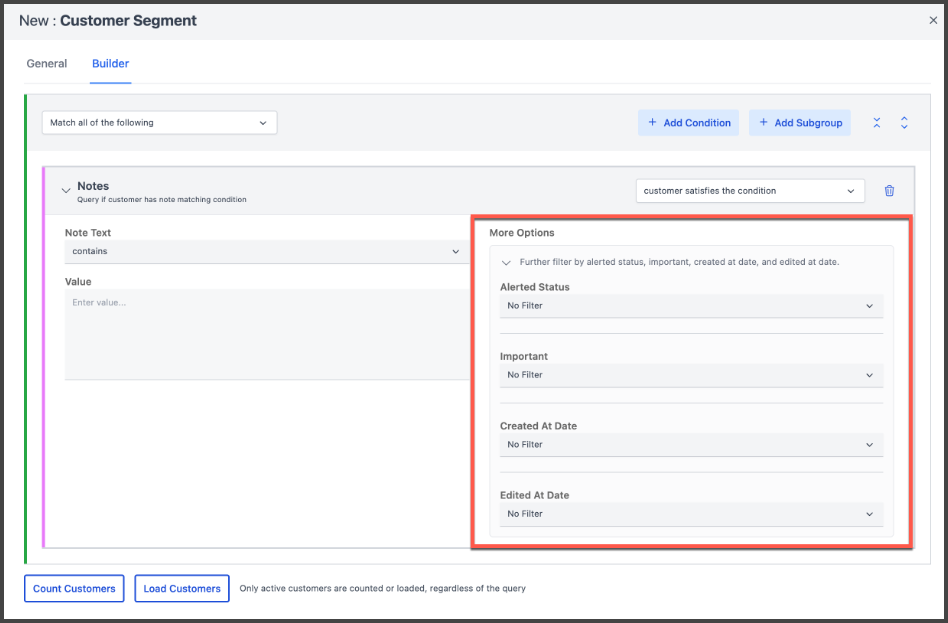 Added more advanced options for segmenting customers based on 'Notes' on their customer record beyond text content. Options include: Alerted Status, Important (note setting), Created At Date, and Edited At Date.