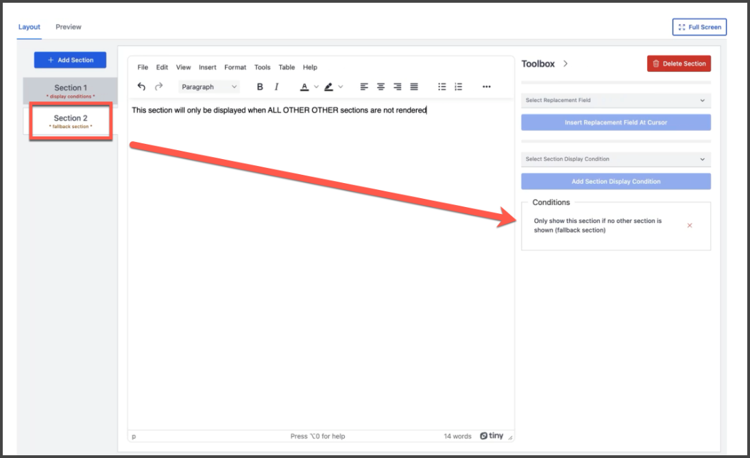 You can now set a section to display only when none of the other section conditions are met. This makes it simple to define one version for a specific condition and a separate default version for all remaining email and document cases.