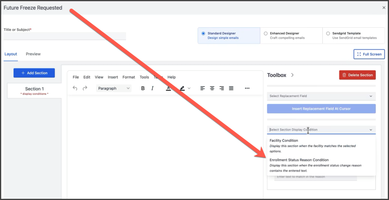 You can now show or hide parts of an enrollment status email (or document) based on the reason entered for that status change.