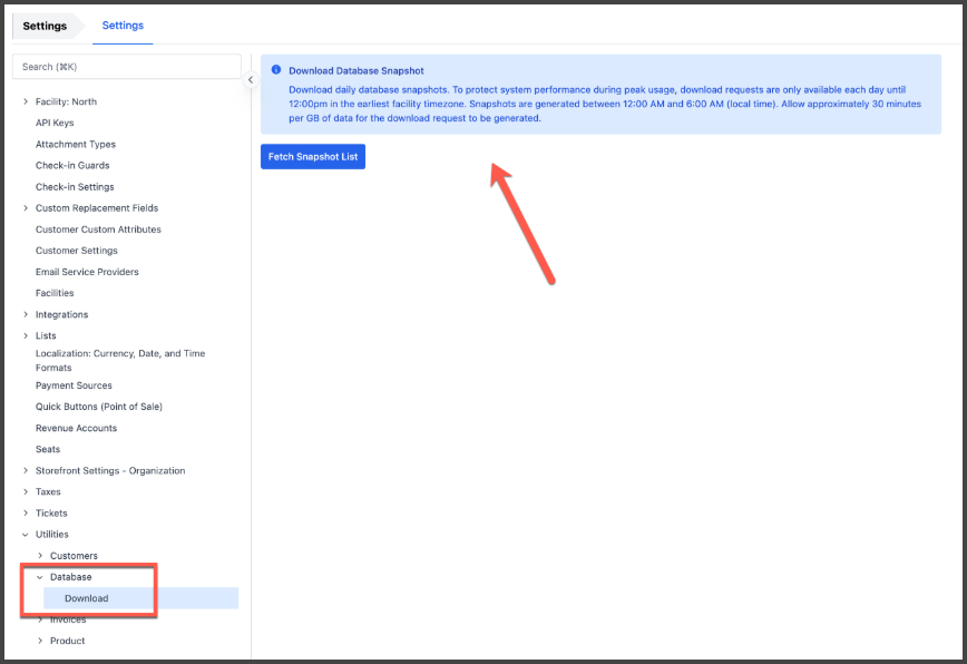 Manage (Menu) > Organization & Facility Settings > Utilities (dropdown) > Database