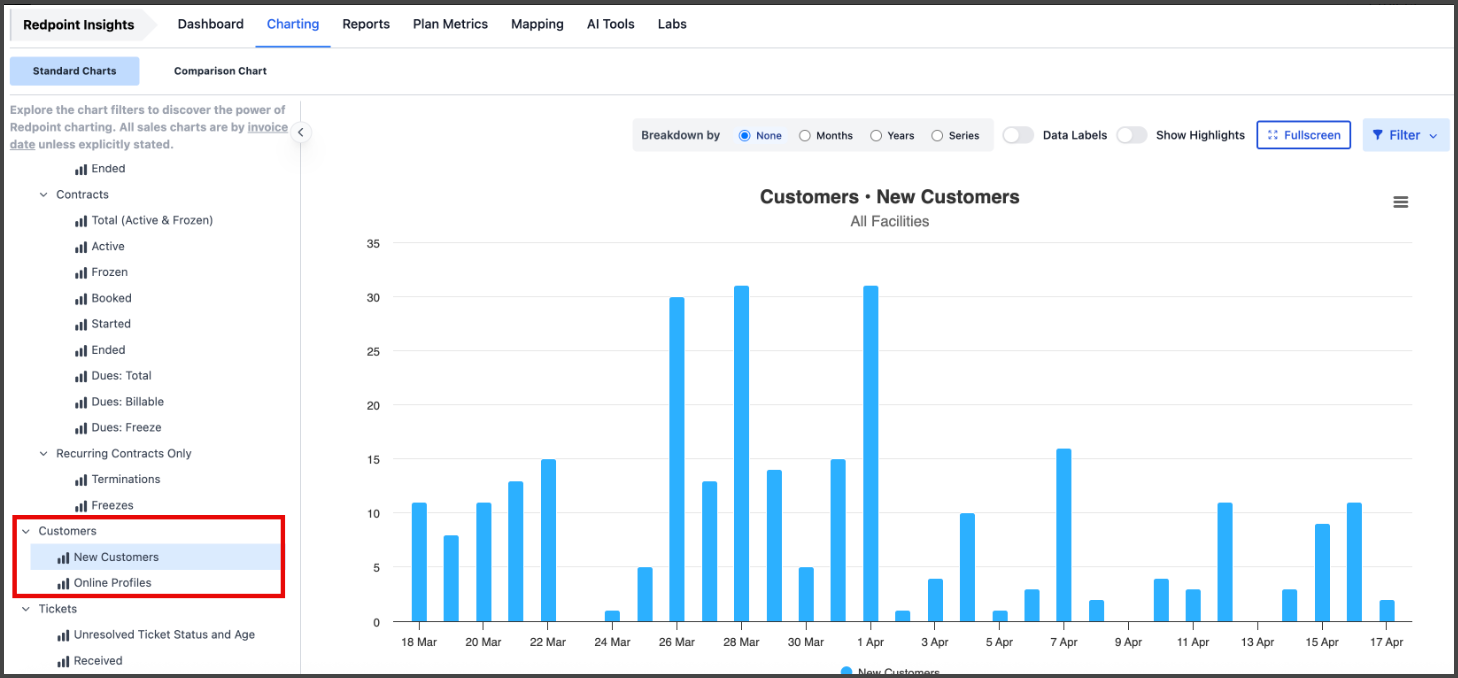 In Insights (Menu) > Charting > Standard Charts (Tab) > Customers (Dropdown)