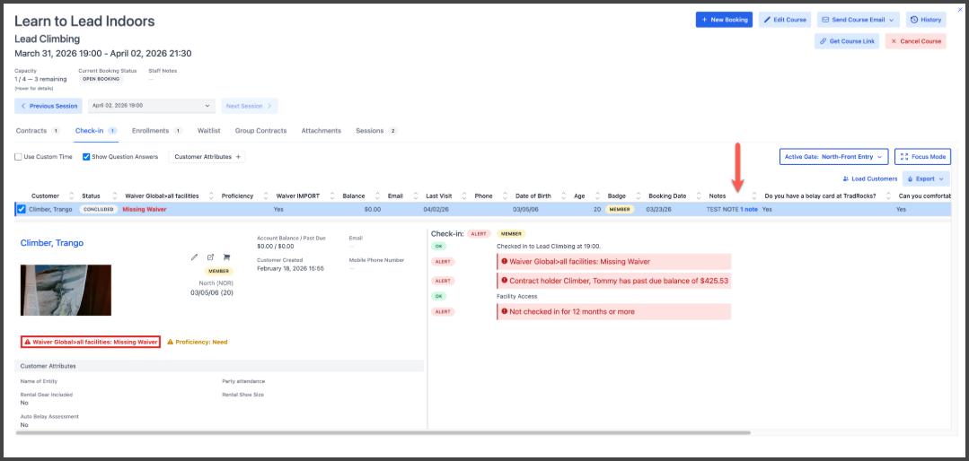 Course check-in now makes important customer context easier to spot. Staff can see contract and customer note previews directly in the notes column, open the full note history when needed, and quickly identify customers with alerted notes before checking them in.